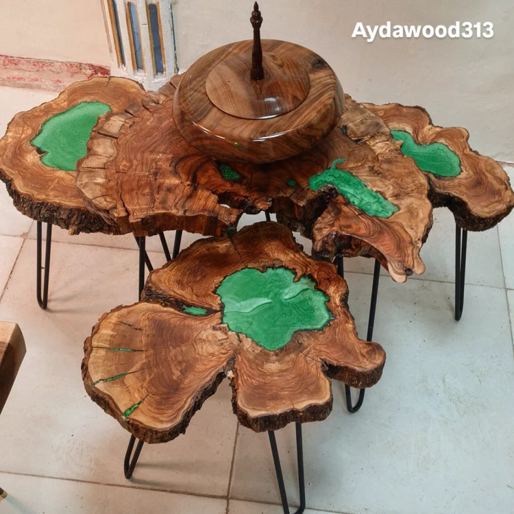 ست چهار تیکه میز عسلی چوب زیبای زیتون و رزین پایه سنجاقی